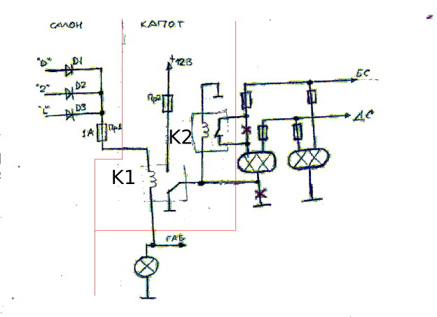 Второй вывод обмотки реле К1 подключен к плюсовому проводу габаритных огней, при включении габаритов ходовые огни будут выключены. Провод из фары подключенный к массе необходимо отключить. Так-же необходимо разорвать провод подключенный к ближнему свету той-же фары и подключить к нормальнозамкнутым контактам второго реле. Второе реле нужно для того чтобы не горели лампы ближнего света фар в качестве ходовых огней.