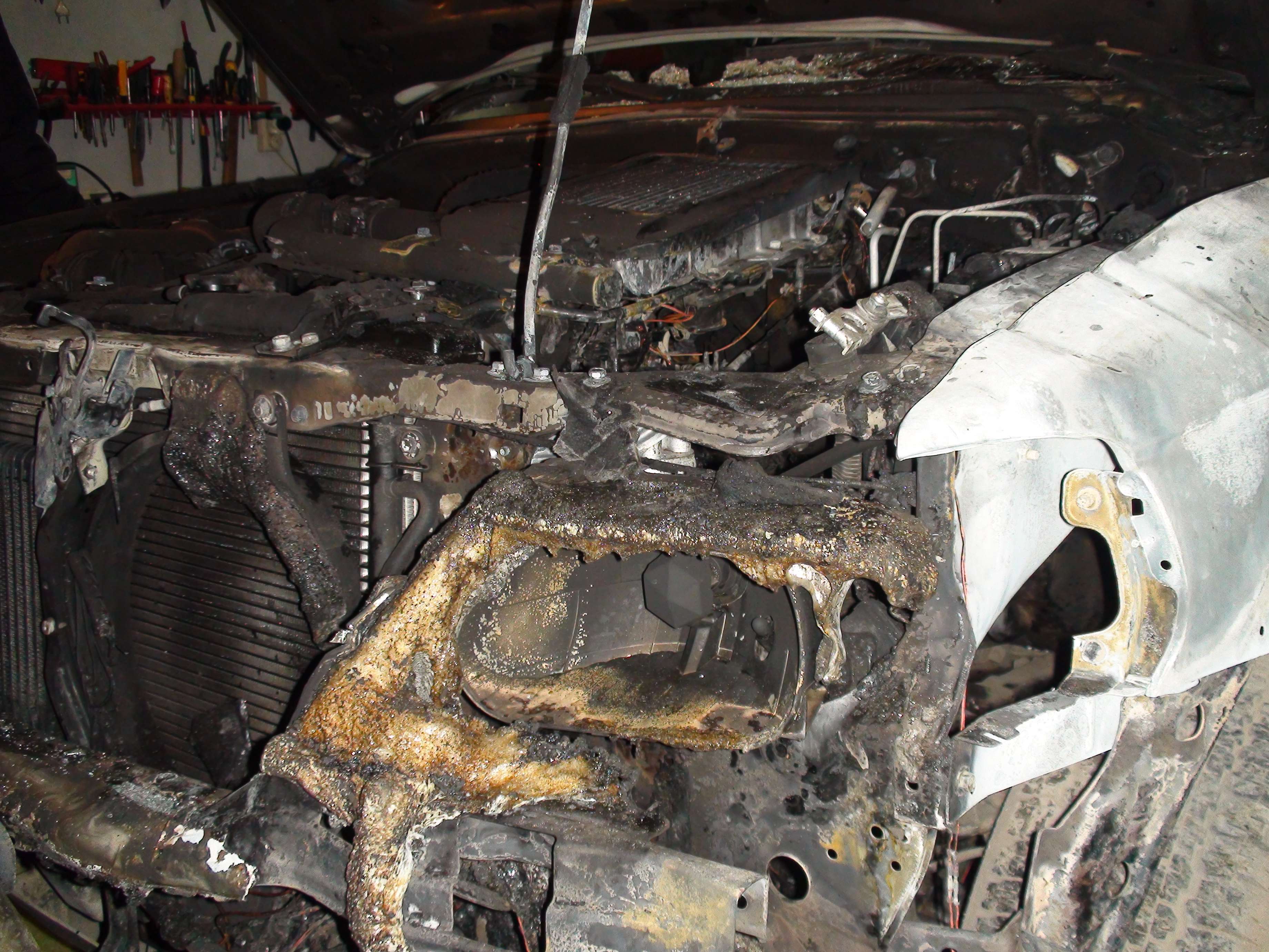 Обгорело(сверху)навесное оборудование двигателя,АКБ,проводка,шланги,кусок панели приборов,левое переднее колесо+подвеска передняя слева.