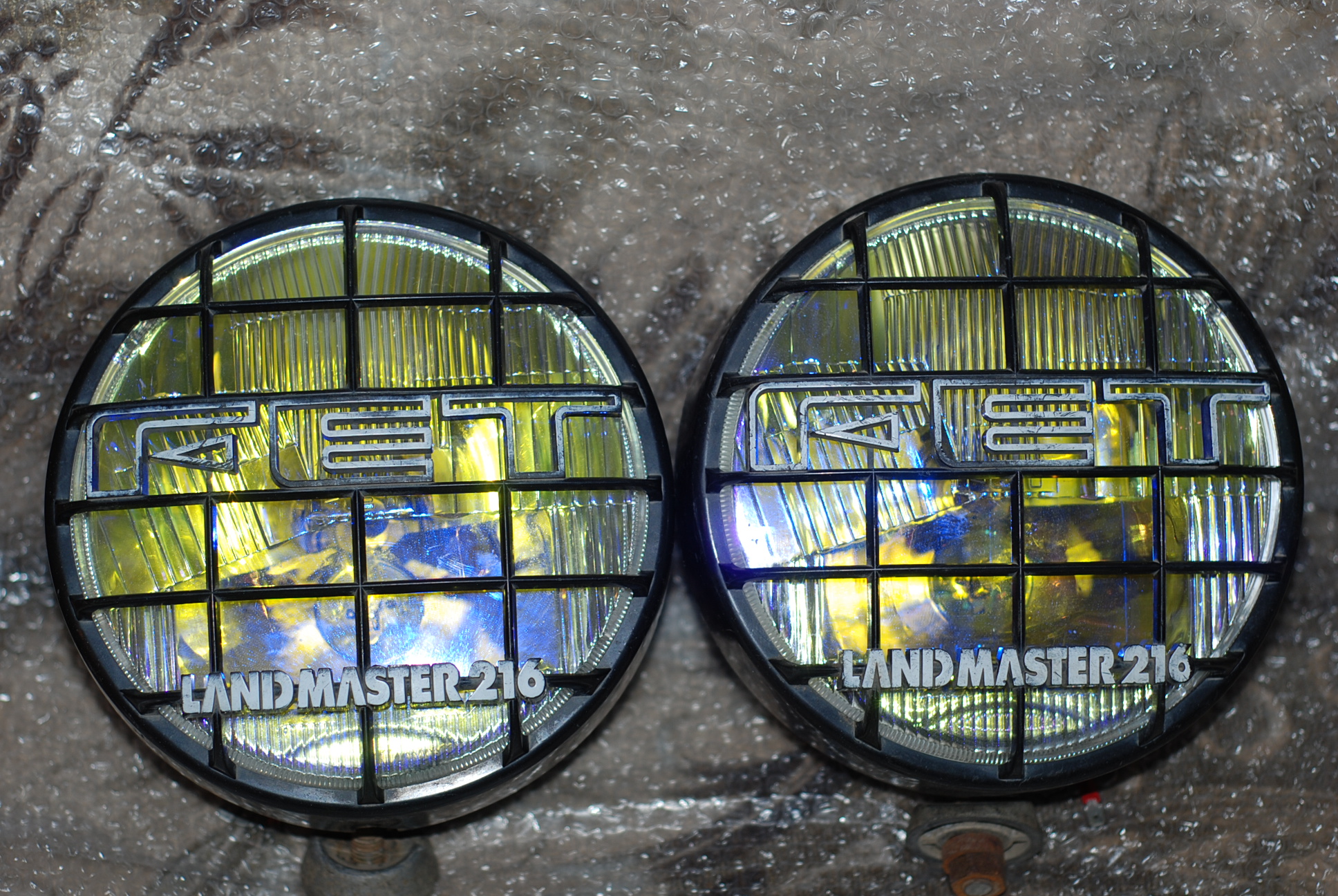 2) FET Landmaster 216 без проводки, желтые, с решетками, лампы h4 ближний дальний, лампа h1 прожектор, 6000 руб
