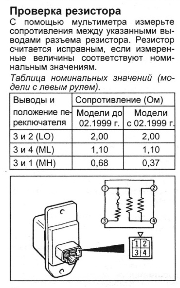 В печке работает только 3 и 4 скорости. Отвинтил резистор, прозвонил - контакты L и М1 не звонятся. Пластиночка предохранителя не отпаяна.