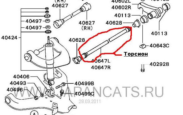 К нижнему рычагу , к его задней части крепится торсион (длинный такой стальной пруток на лом похожий