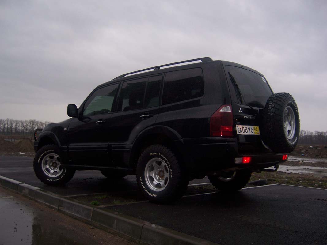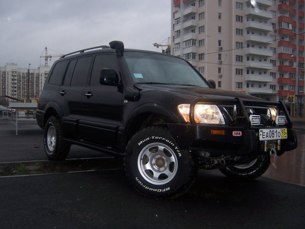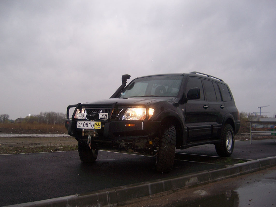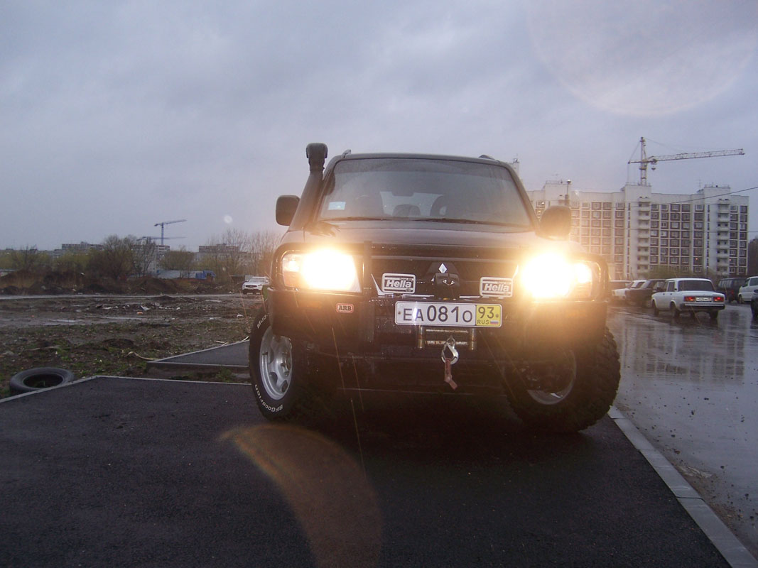 Подготовка: Установлен 2-х дюймовый лифт-комплект подвески австралийской фирмы «OME» (усиленные пружины, амортизаторы с увеличенным ходом поршня), штатный передний бампер заменен на силовой (5 мм.) бампер австралийской фирмы «ARB», в силовой бампер установлена лебедка «COME UP» на 4,5 тн. с дистанционным управлением от беспроводного пульта, также на силовой бампер установлены галогеновые противотуманные фары «HELLA», система воздухозабора в двигатель доработана путем установки шноркеля «ARB Safari» для преодоления водных преград, штатная пластиковая защита картера двигателя заменена на 3-х мм. стальную 4-х секционную защиту (рулевых тяг, картера двигателя, коробки передач и хвостовиков раздаточной коробки) фирмы «ШЕРИФ», под задним бампером установлен фаркопф с электрическим подключением для буксировки прицепа, доработан задний блок фонарей путем добавления стоп-сигнала и противотуманок, заменены передние сайлентблоки и тяги на оригинальные фирмы «MITSUBISHI», также заменены все ступичные подшипники и тормозные диски, на автомобиле стоят кованные диски «ВСМПО» с вылетом «–10» и резина «BF GOODRICH KM2» на 32 дюйма.