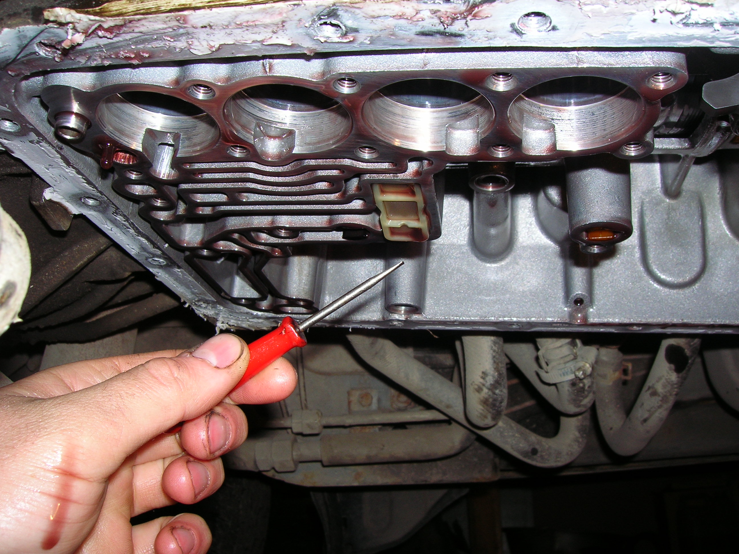 Теперь началась самая ответственная работа СНЯТИЕ ГИДРОПЛИТЫ. Откручаваем ТОЛЬКО болты золотистого цвета. Необходимо помнить, что у каждого из них свое место.ОНИ РАЗНОЙ ДЛИНЫ. По мере откручивания начнет интенсивно стекать жидкость (около 2х литров), будьте готовы. Остановитесь минут на десять оставив гидроплиту на 3х-4х болтах. С болтами я поступил так.