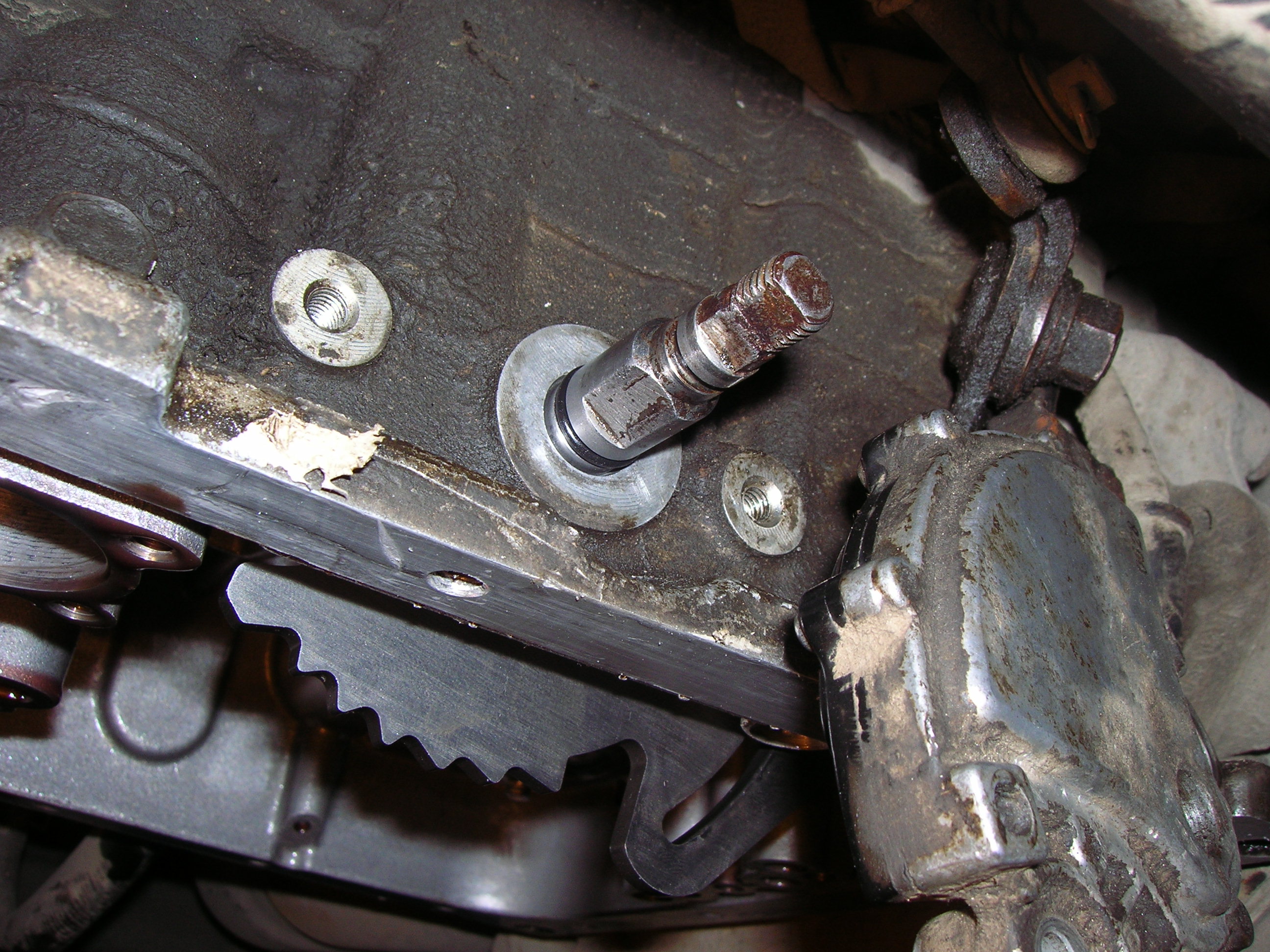 Потом скидываем минусовую клемму, переводим кробку в положение "N", и снимаем тягу переключения режимов с оси и датчик положения рычага переключения режимов (два болта). На фото видно следы подтекания сальника.