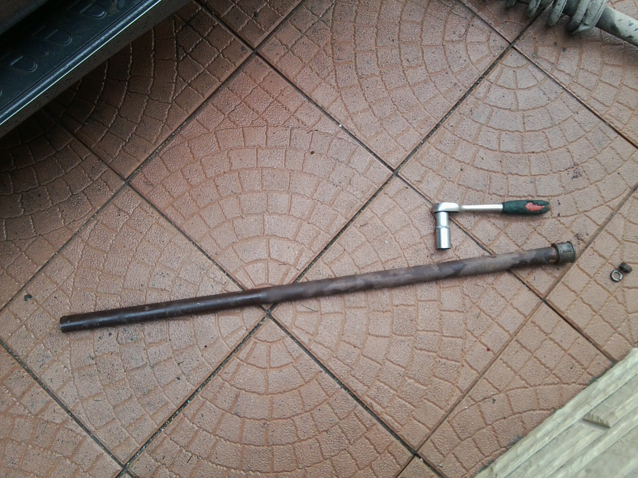 Затем отсоединил нижний рычаг от стабилизатора. От верхнего рычага открутил шаровую, в результате нижний рычаг вместе с поворотным кулаком ушли вниз. С помощью вот такого рычага открутил болт крепления амортизатора к нижнему рычагу, потом три гайки крепления стойки в моторном отсеке.
