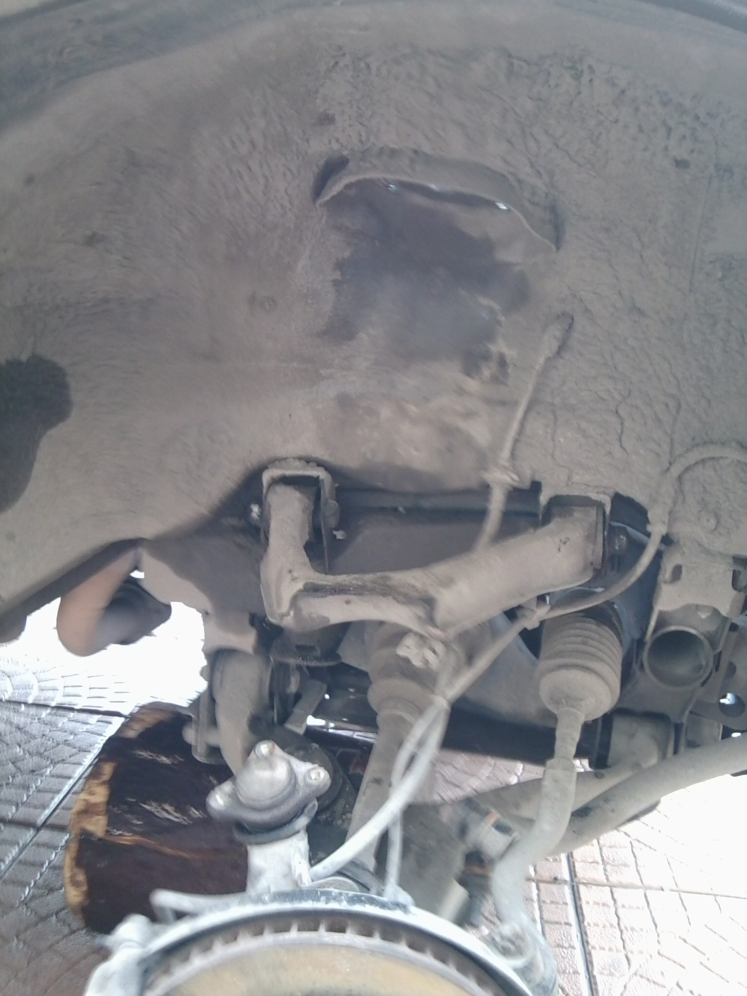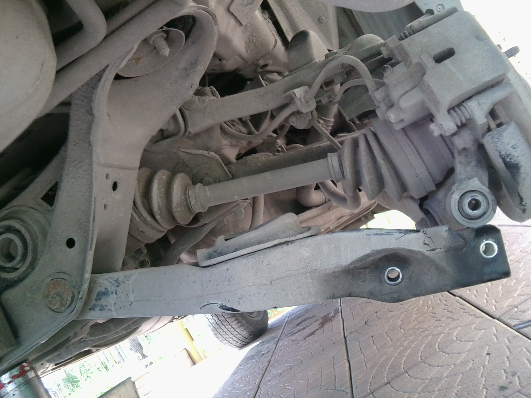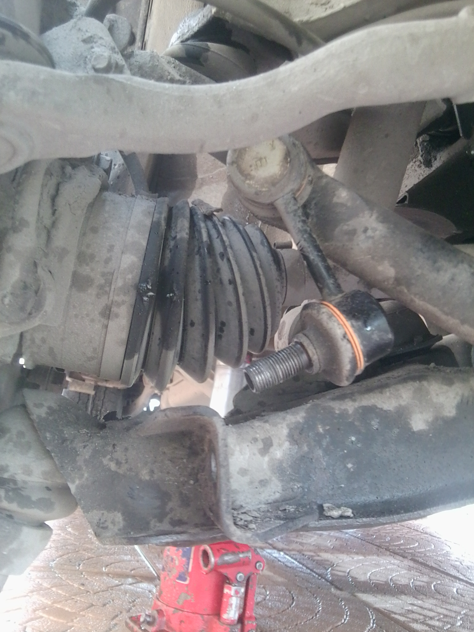 Ну и в обратной последовательности собираем все обратно. Чтобы прикрутить шаровую к верхнему рычагу и вставить стойку стабилизатора в нижний рычаг вторым домкратом поднимаем нижний рычаг. Вот здесь у меня приключилась маленькая неприятность. Когда закручивал последний болт крепления шаровой, я его сломал! Ладно, это еще пол-беды, начал высверливать, сломал в нем сверло!! Но все равно, удалось победить и расковырять отверстие нужного диаметра. Но вот когда начал нарезать резьбу я сломал там мечек!!! Понял, что это провал. Плюнул. Неделю ездил на двух болтах, в следующие выходные купил шаровую и поменял. Да вот еще что: болт крепления амортизатора затягивается, когда машина уже снята с домкрата и стоит на колесах.