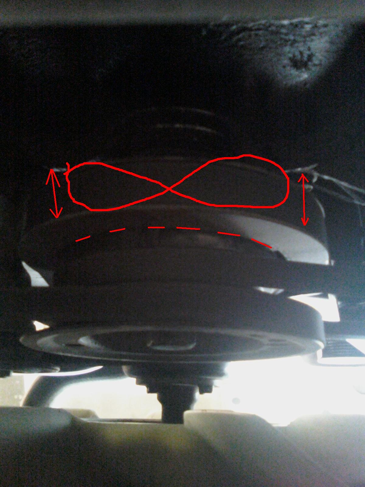 поясню как могу на пальцах хрень которая ближе к движку крутится восьмёркой и свистит на ней ручековый ремень, ровняю её с низу отвёрткой - садится ровно на резинку эту, при заводе через секунду опять крыво вертится, чего сделать надо, чего поломалось? .... щас с фонариком полез сделал фотки чуть получше эту резинку видно