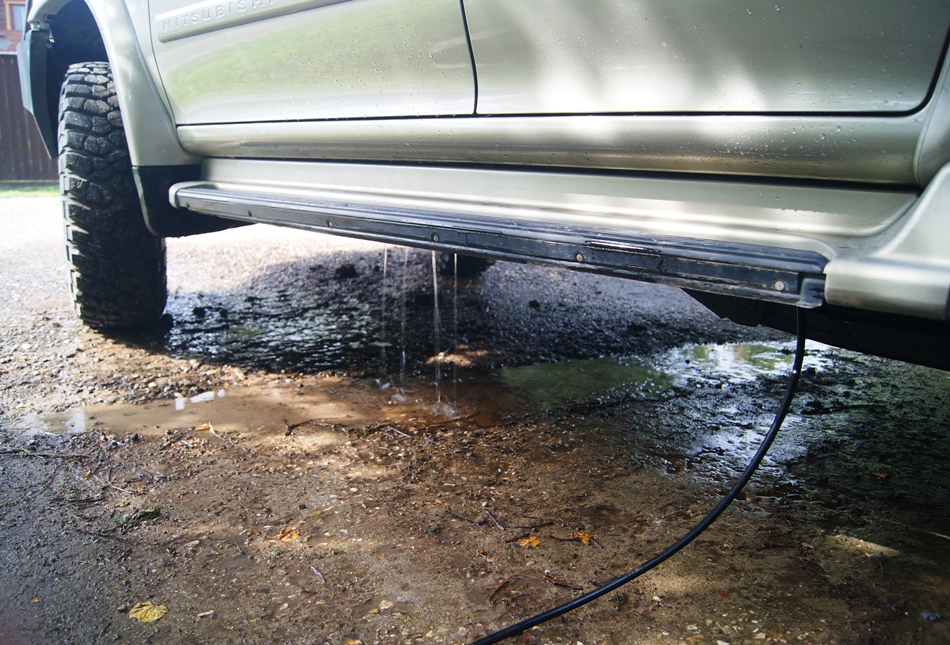 У меня валялся шланг от старого маленького Керхера 2 серии и новый Керхер 5 серии со всеми причиндалами. От старого взял шланг, отрезал от него пистолет. В шланге просверлил насквозь дырку 5 мм и вставил туда винт М5 с шайбами и гайкой. Закрутил винт и таким образом заглушил шланг. Раскаленным гвоздем (диаметр 1 мм) проколол 4 дырки рядом с винтом, чтобы вода била вбок во все стороны. Шланг присоединил к новому Керхеру. Инструмент для промывки готов!