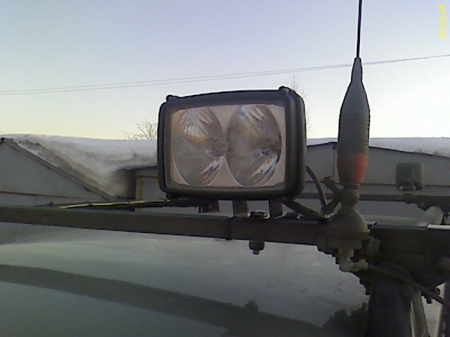 К левому рейлингу в его передней части болтами прикручен оцинкованный уголок из строительного магазина, доработанный болгаркой. На нем живет антенна. Перед антенной просверлена дырка для привинчивания люстры. В эту дырку болтами привинчивается поперечина с фарами, см. фото несколькими постами выше.