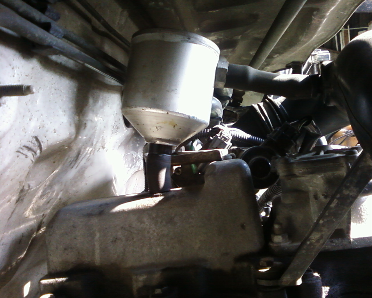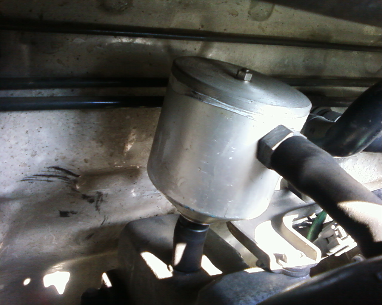 да конструктив прост...емкость с кружку размером, входной и выходной патрубки расположены исходя из расположения в моторном отсеке. на первом экземпляре входной патрубок врезан в нижний торец уловителя, выходной - на боковой поверхности , внутренний объем его заполнен губками для мытья посуды (те которые из нержавеющей стружки скручены).