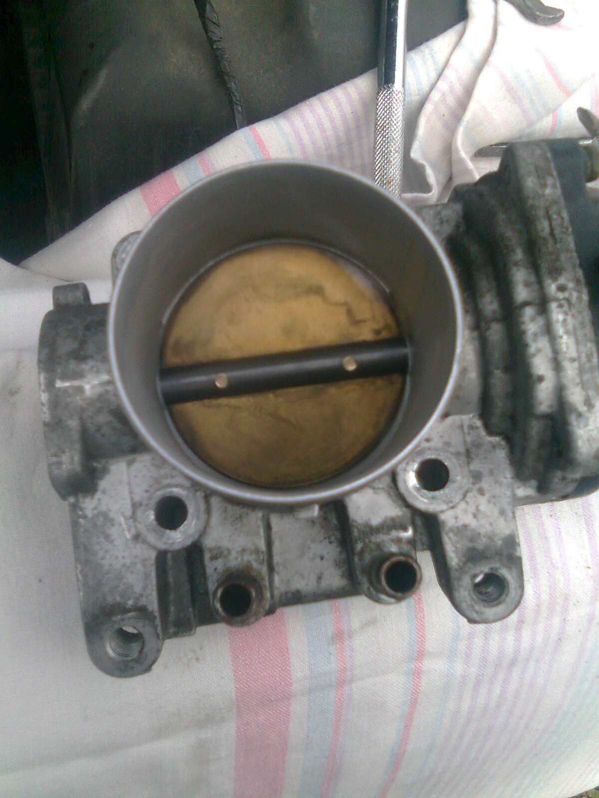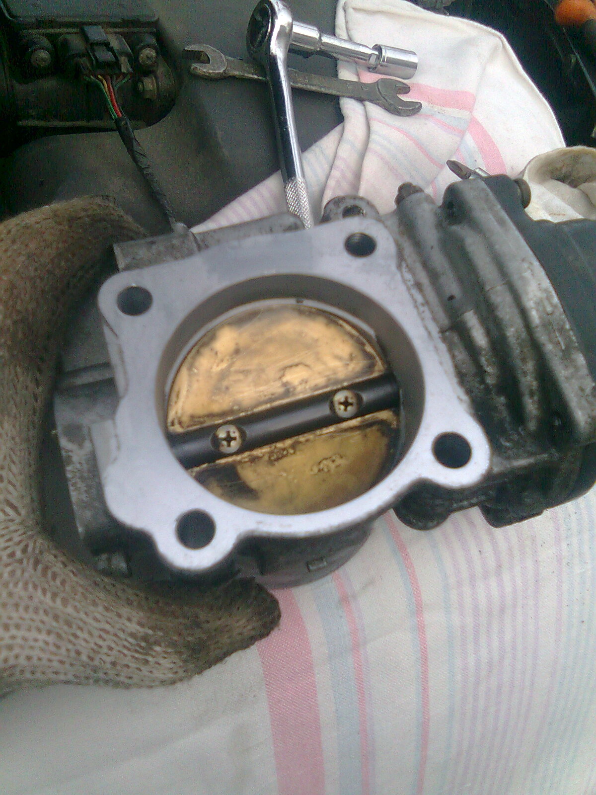 Снимайте ее. Для этого нужно будет снять тросик, трубки с антифризом, 4 винта (на 10 кажется), осторожнее с прокладкой! После того, как снимете прочистить вышеуказанным карбоклинером, смело лейте во все дырки. После, дать сбежать жидкости, просушить, протереть, что возможно и устанавливать. На время работ лучше скинуть клеммы с аккумулятора. После всего обучаем холостому ходу. Вот только после этого, если изменений не будет, только тогда добавить винтом.