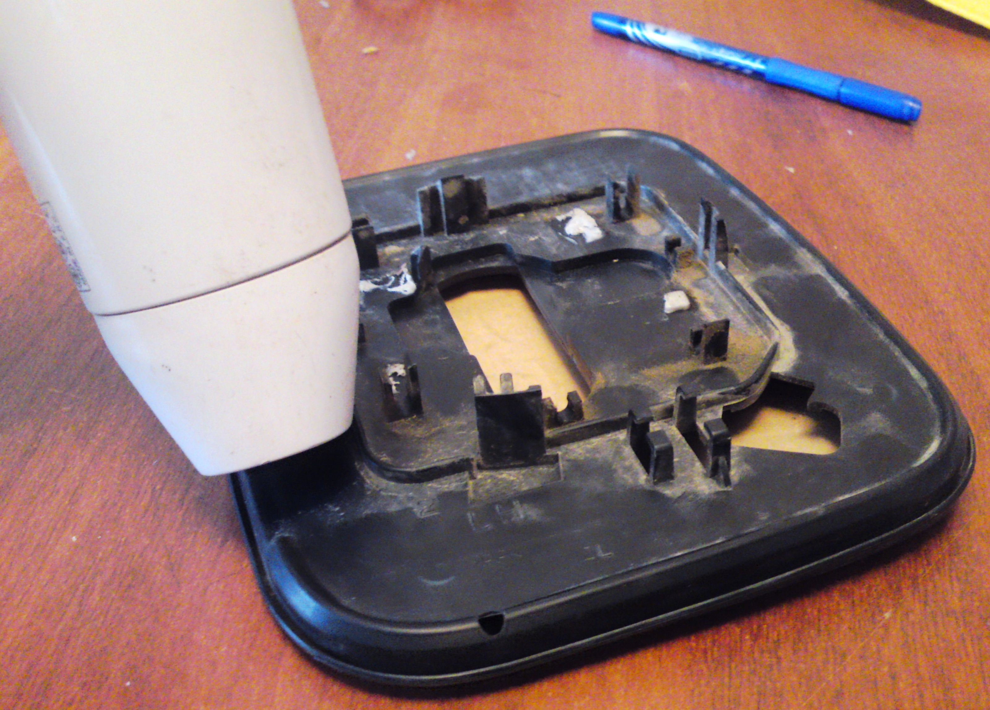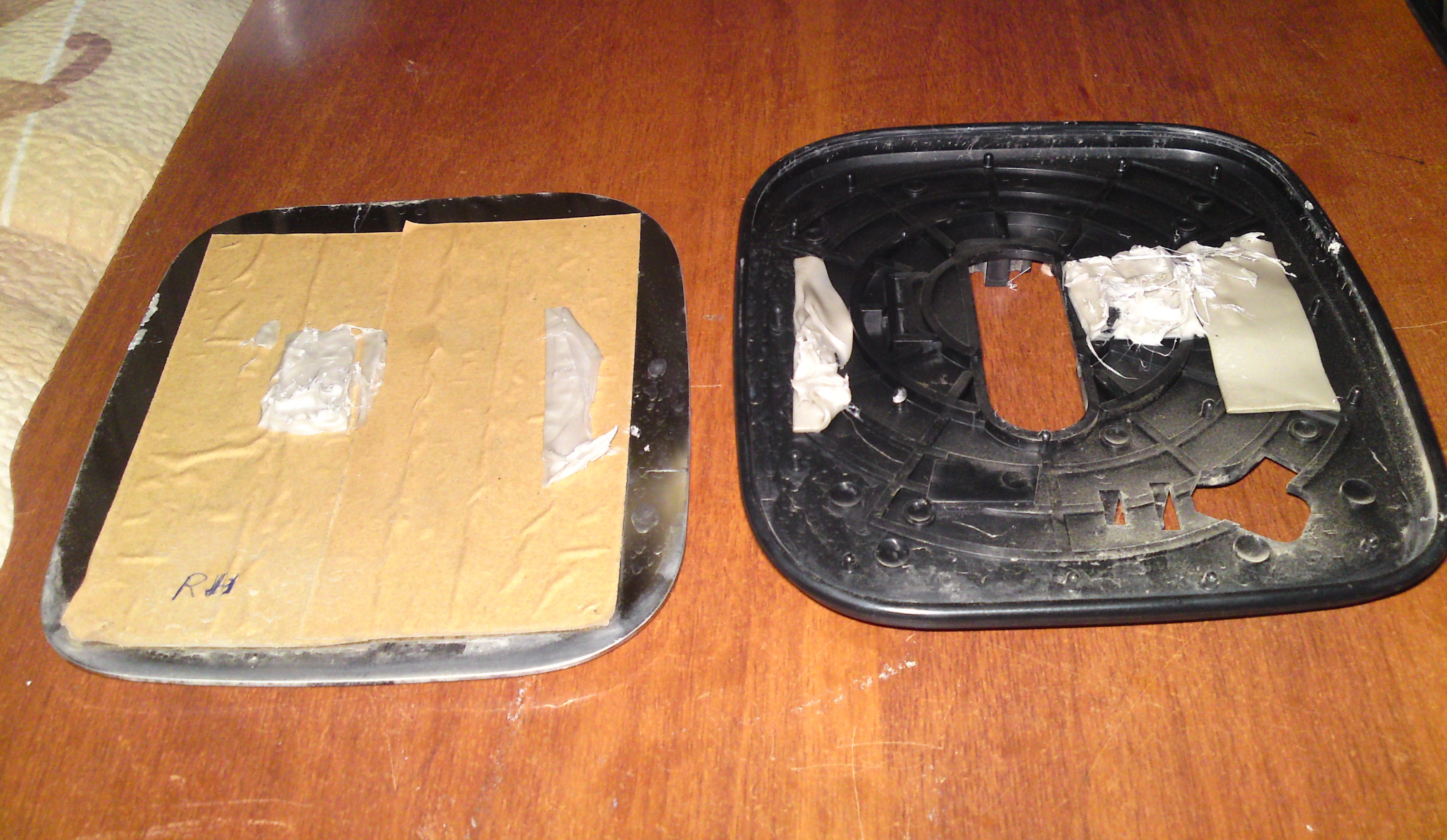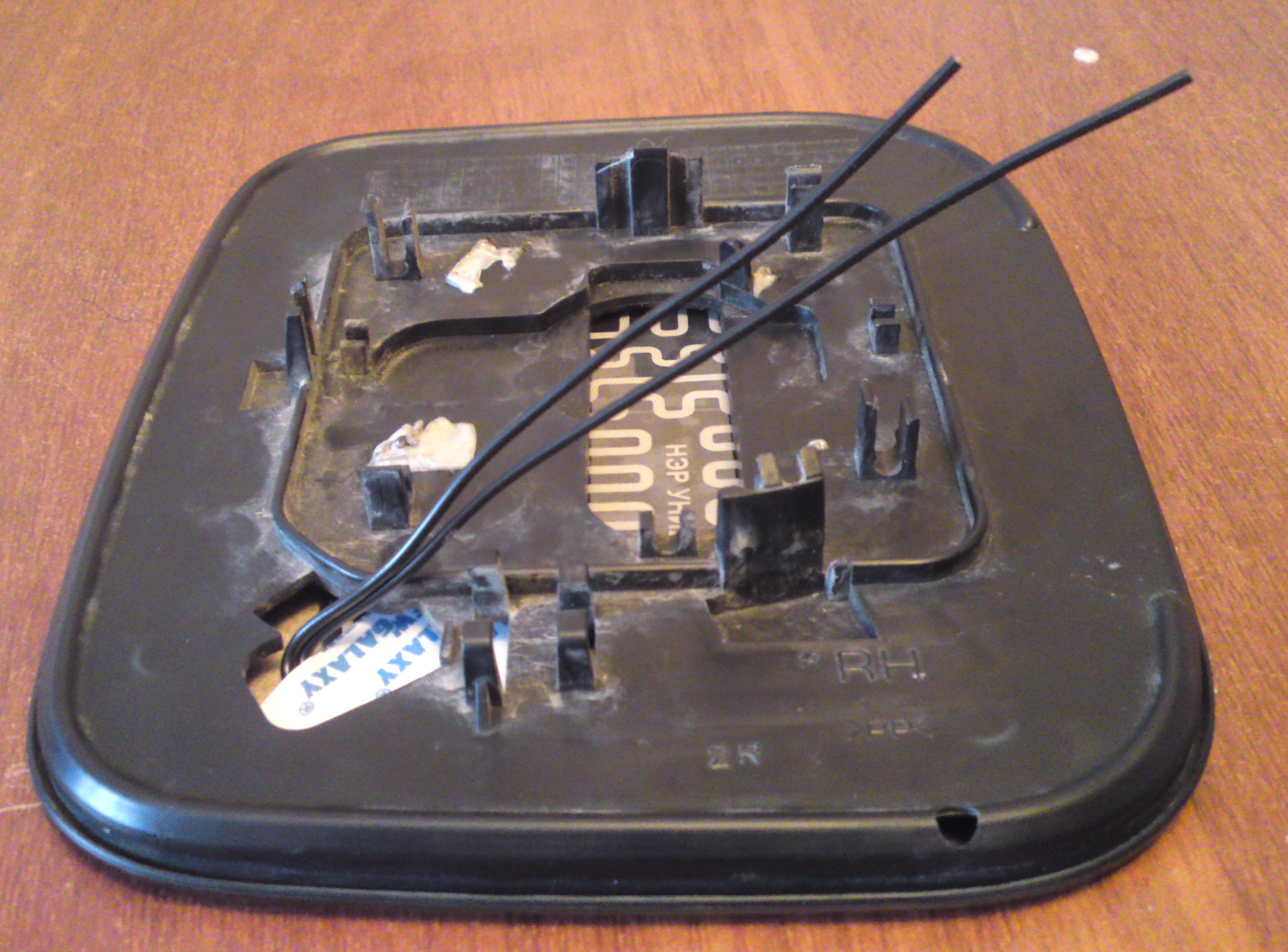 Снять зеркальный элемент – двигаем его в крайнее верхнее положение, в образовавшуюся щель снизу просовываем пальцы и тянем на себя, так зеркало снимается с защелок и оказывается у нас в руках. Далее необходимо вытащить само зеркало из его пластиковой оправки – для этого нужно эту пластиковую оправку нагреть, я для этого использовал обычный фен ( которым пользуется ежедневно супруга))). Если у кого то супруга будет сильно ругаться, можно, для нагрева, опустить зеркало в горячую воду (опускать осторожно потому как может треснуть, сам не пробовал читал в сети). Итак греем пластик 3-5 минут и аккуратно отгибая пластик вытаскиваем зеркало. Внутри зеркало приклеено каким-то липким составом, поэтому как только оно выйдет из оправки нужно тонким длинным ножичком подрезать этот состав. Теперь клеим двухсторонний скотч на нагревательный элемент, обрезаем его по контуру и клеим всё это на само зеркало. Я сместил подогрев вниз и ближе к авто, потому как эта зона более важна при парковке. И просунув провода в отверстие вставляем зеркало обратно в пластиковую оправку, не забыв так же нагреть пластик. На этом первый этап закончен.