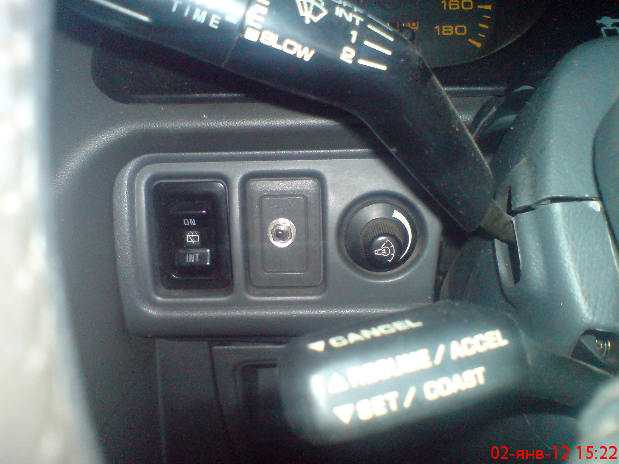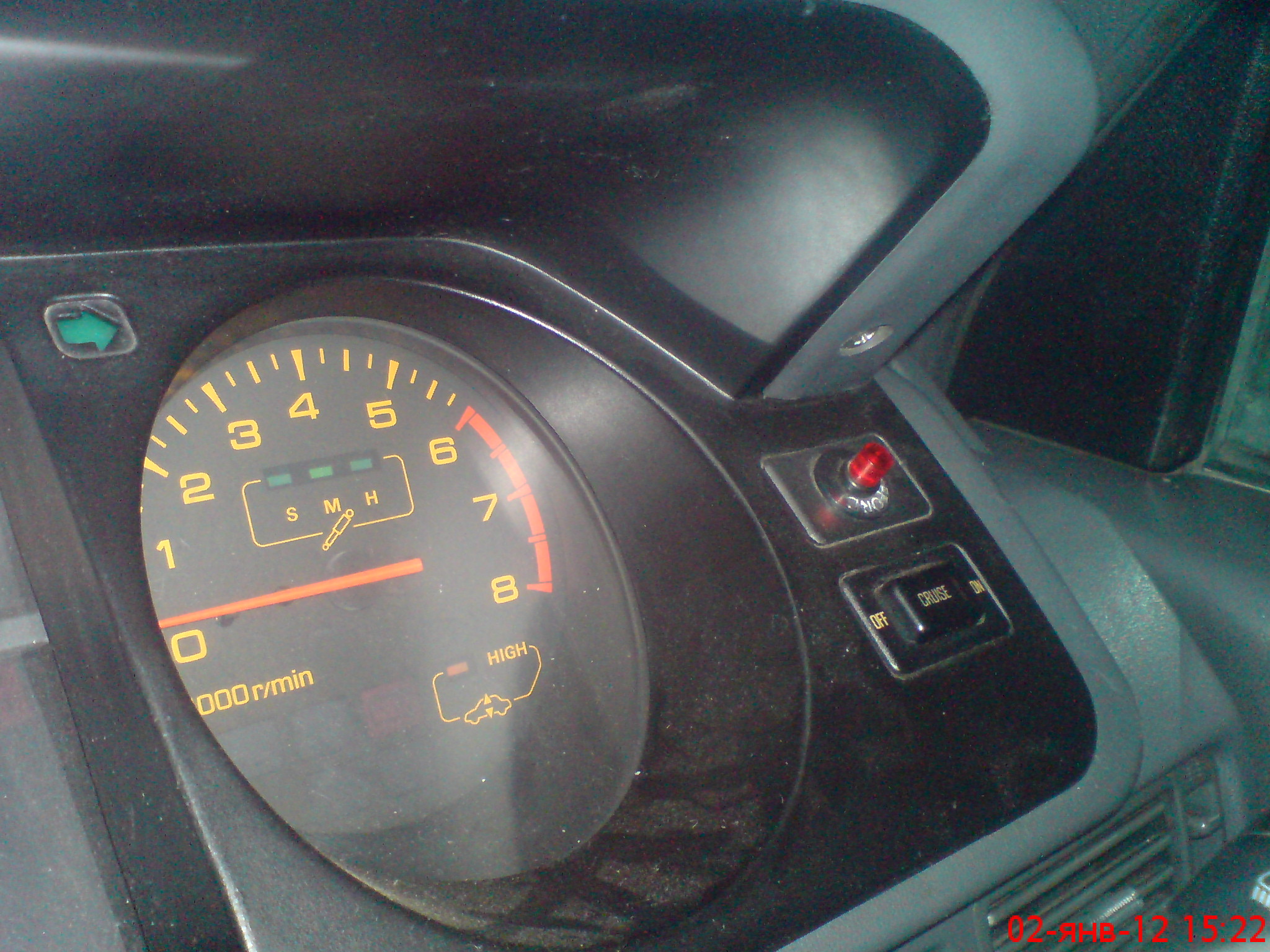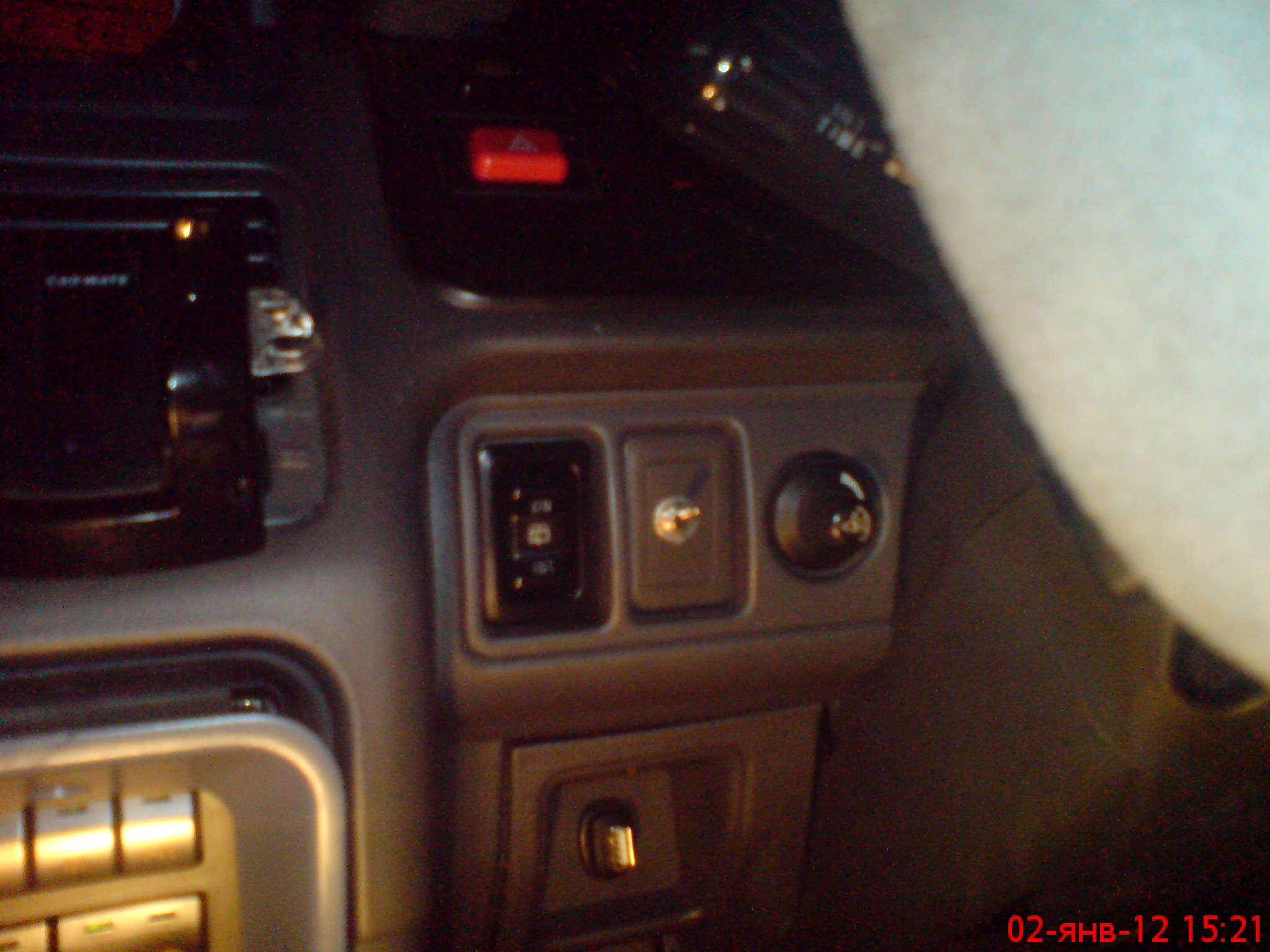 Ну вот... сигналки нет, брелка нет. Руль справа, "красная лампочка" - это светодиод от сигнализации. Включается тумблером и горит, показывая будто машина на сигнализации. Через окно с улицы хорошо видно.
