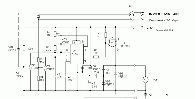 . Нравится то, что лампы работают в щадящем режиме, включается автоматически и выключается при начале движения, то есть фары не светят после срабатывания автозапуска. Ставил в корпус сделанный с люминия, простейшая коробочка из двух п-образных крышеек с разъемом, на всякий случай, но так не разу и не снимал. Транзистор конечно на радиаторе подходящем. А подстроечником выставлял около 8 вольт. На схеме пунктиром вариант с другой машины там не было лампы паркинг.