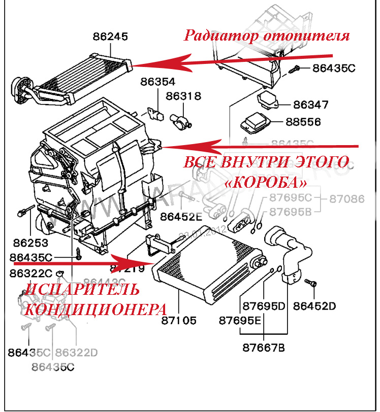 На картике два "радиатора", они находятся внутри "короба", от этого короба отходят патрубки, подходят тросики управления, все это укреплено... В общем НАМНОГО проще разобрать всю торпеду и вытащить, чем удалять гланды через задний проход