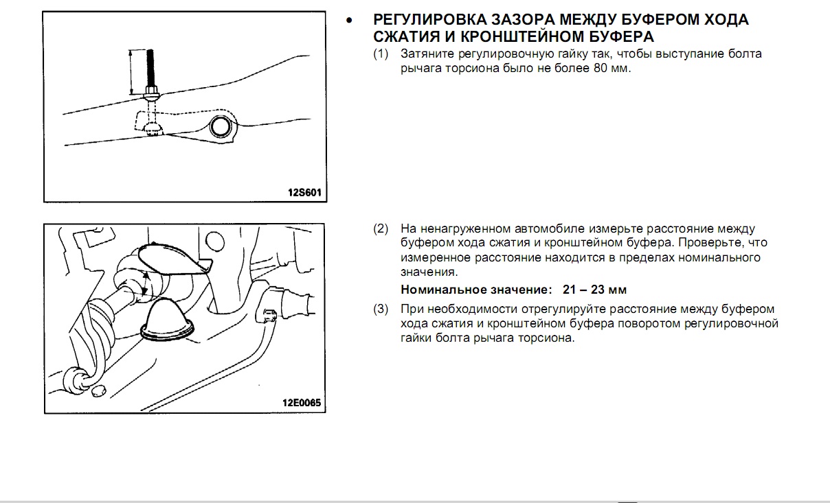 Дето писал.... короче там на торсионах есть болт..и гайки...вот их и надо крутить...а крутить до того момента пока растояние м/у нижним отбойником не станет 21-24 мм... покрутил машинку покачал замерил.... дело муторное но не сложное... машине так и хочет перекосится то одна сторона выше то вторая... лови момент))) да сам болт не должен вылезать выше 80 мм... вся эта процедура в мануале описана! читай!