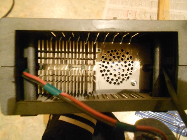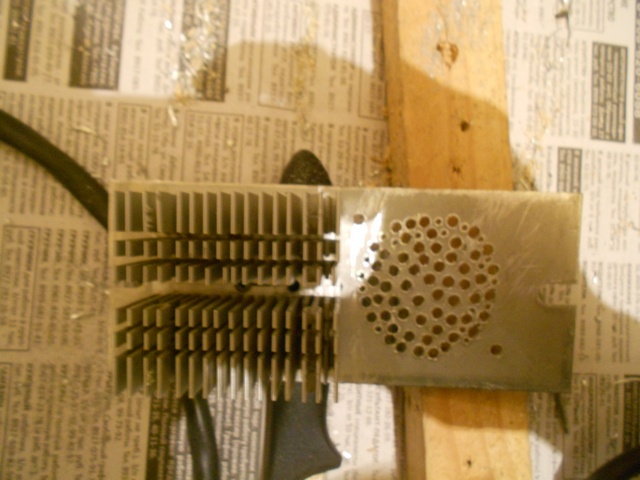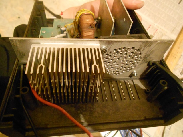 Дальше все в принципе видно на фото. Радиатор крепил маленькими винтами на М3х 20 мм на теплопроводную пасту. Кулер изначально хотел поставить сверху, не умещался по толщине, пришлось закрепить на заднюю стенку, чтобы обдувал две пластины. Для этого рассверлил в друшлаг стенку под него. С передней крышки также рассверлил несколько отверстий. Провода припаялись на выход 12в. Все работает. Надеюсь, греться уже не будет.