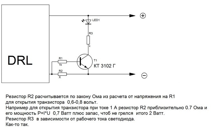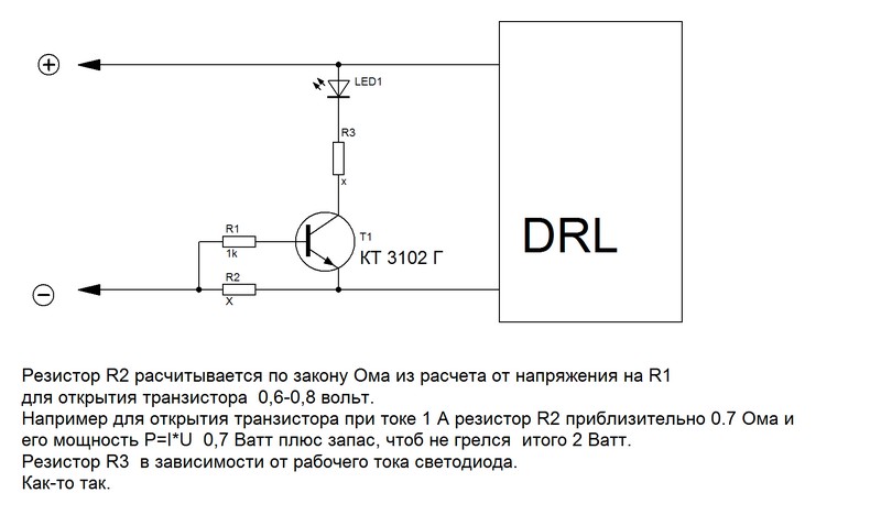 Простенькая схемка - светодиод горит когда работают ДХО, типа как при включении дальнего или противотуманок.дед61 писал(а):Контроль за работой ДХО ВКЛ.или не ВКЛ. На мой взгляд должно быть так-же как мы контролируем габаритные огни.Да можно по току подобрать шунт (ставится в разрыв цепи) и с него запитать светодиод.Янадеялся,что у кокого-то уже сделано.А раз нет,то придется вспомнить школу.