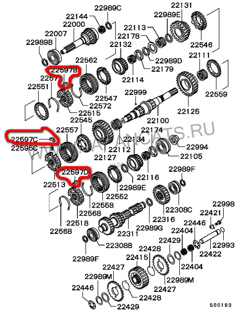 Спасибо!Это уже даёт ясную картину происходящего!Скажите а причина какая этого явления(понятно,что руки не оттуда растут у того,кто перебирал) может быть,ведь все три фиксатора слетело!?Получается пружинные кольца износились???FOX 38 писал(а):Это скорее всего фиксаторы муфты переключения передач,крепятся с помощью пружинных колец(на схеме 22568 и 22572) их отсутствие грозит в дальнейшем возможностью "выбивания" той передачи,с муфты которой они "улетели",на само переключение не влияют,их задача удерживать муфту во включенном-выключенном состоянии,снимая там самым нагрузку на вилки переключения передач,износ вилок увеличивается "по умолчанию". Извини,но ничего хорошего это не предвещает,коробка которая начинает разбираться самостоятельно скоро обязательно "попросится" на ремонт и к этому нужно быть готовым.