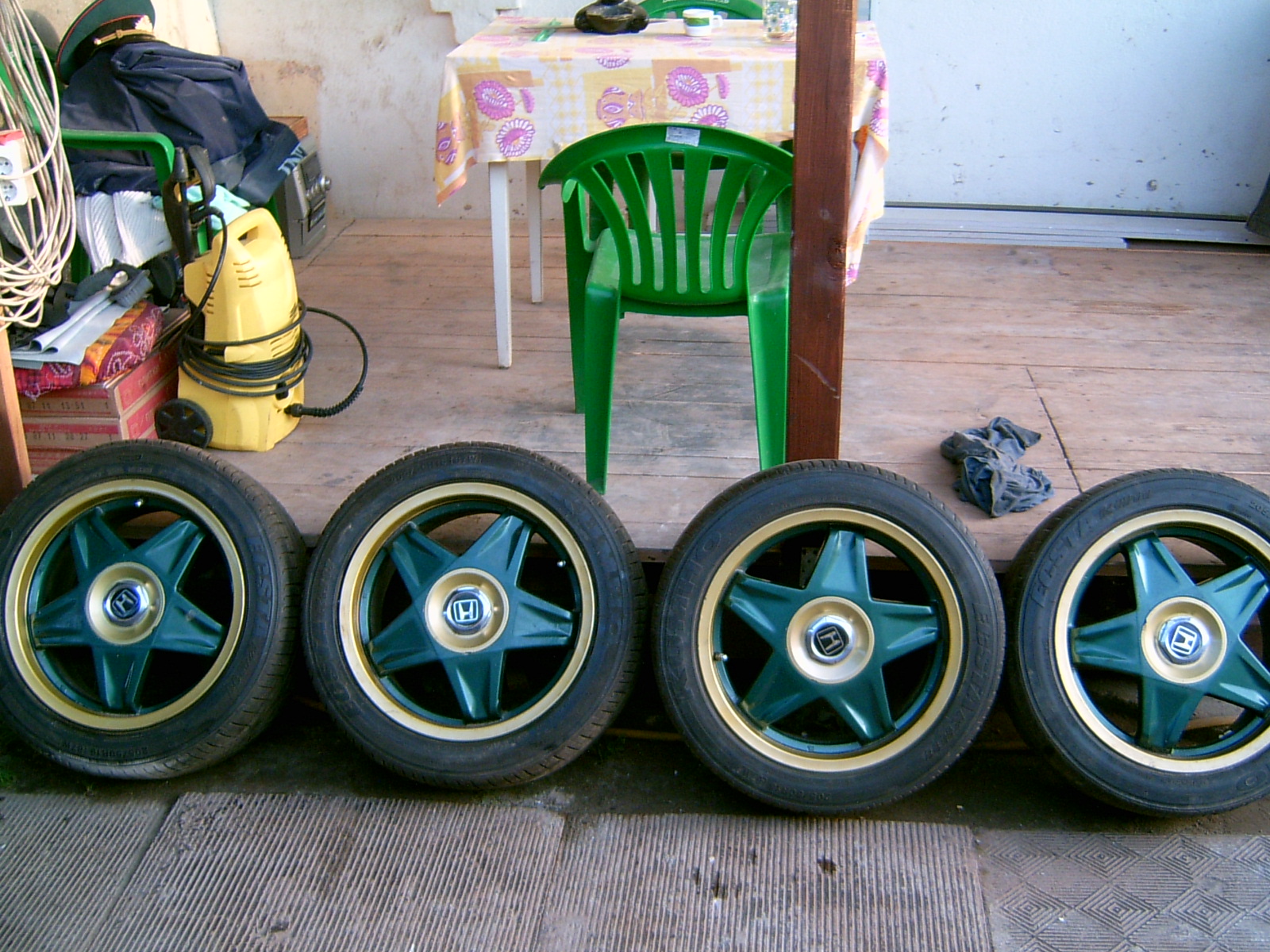 привет. вот фото дисков. сегодня не получилось доехать до гаража и померят ц\о, они стояли у меня на "хонде прелюд" 1998 года. там ступица вроде 65-75мм. обозначение вылета не нашел. но (вылет) наверно около ноля. как и писал два колеса почти новые два поездил, я их ставил на прелюд и гонял ночами на стритрейсинге..( почему говорю что вылет ближе к нулю , потому что на прелюде задние колеса цепляли за арки поэтому и ставил только передние.