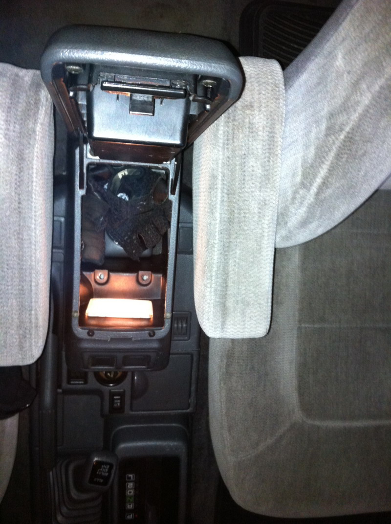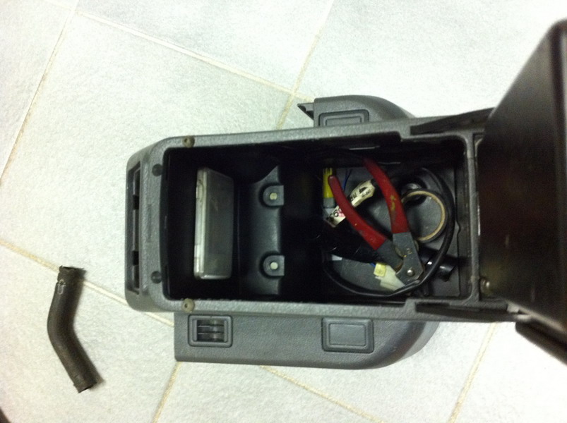 Подсветка центрального бокса. Бокс у меня стоит от NL (который после рестайлинга), он очень высокий и на дне ничего не видно. Пошел на свалку, открутил фонарь подсветки с передней двери Паджеро и концевик откуда то. Еще пара часов и вуаля: