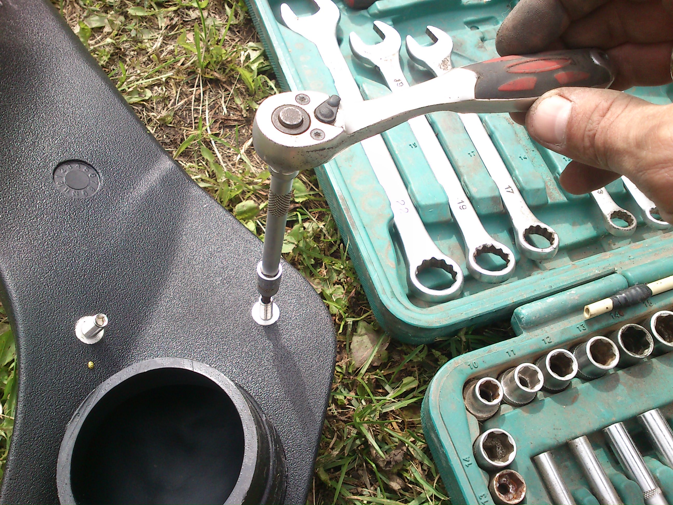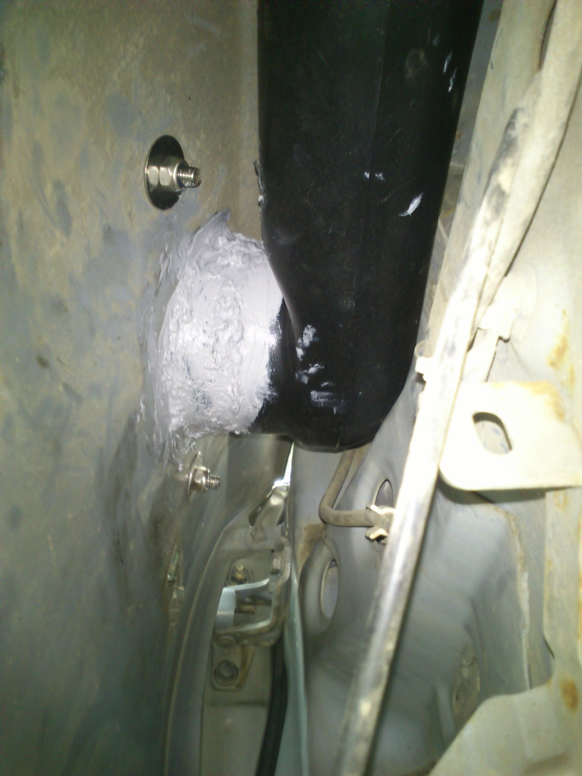 Труба вошла довольно плотно.Сам шноркель и воздуховод в крыле соединял на герметик(там в крыле тесно и труба зажата надёжно).Да там и не подлезешь-а саморез можно вкрутить в соединение тока снизу,но он,по-моему,нах не нужен.Размечаем и крепим шноркель на стойке-это до герметика ::-D: В комплекте на три заклёпки(насадка заклёпочника на"4",отверстия,вроде 5мм)Дырообработка таже+мона внутрь стойки чёнить полезное набрызгать ::-D:
