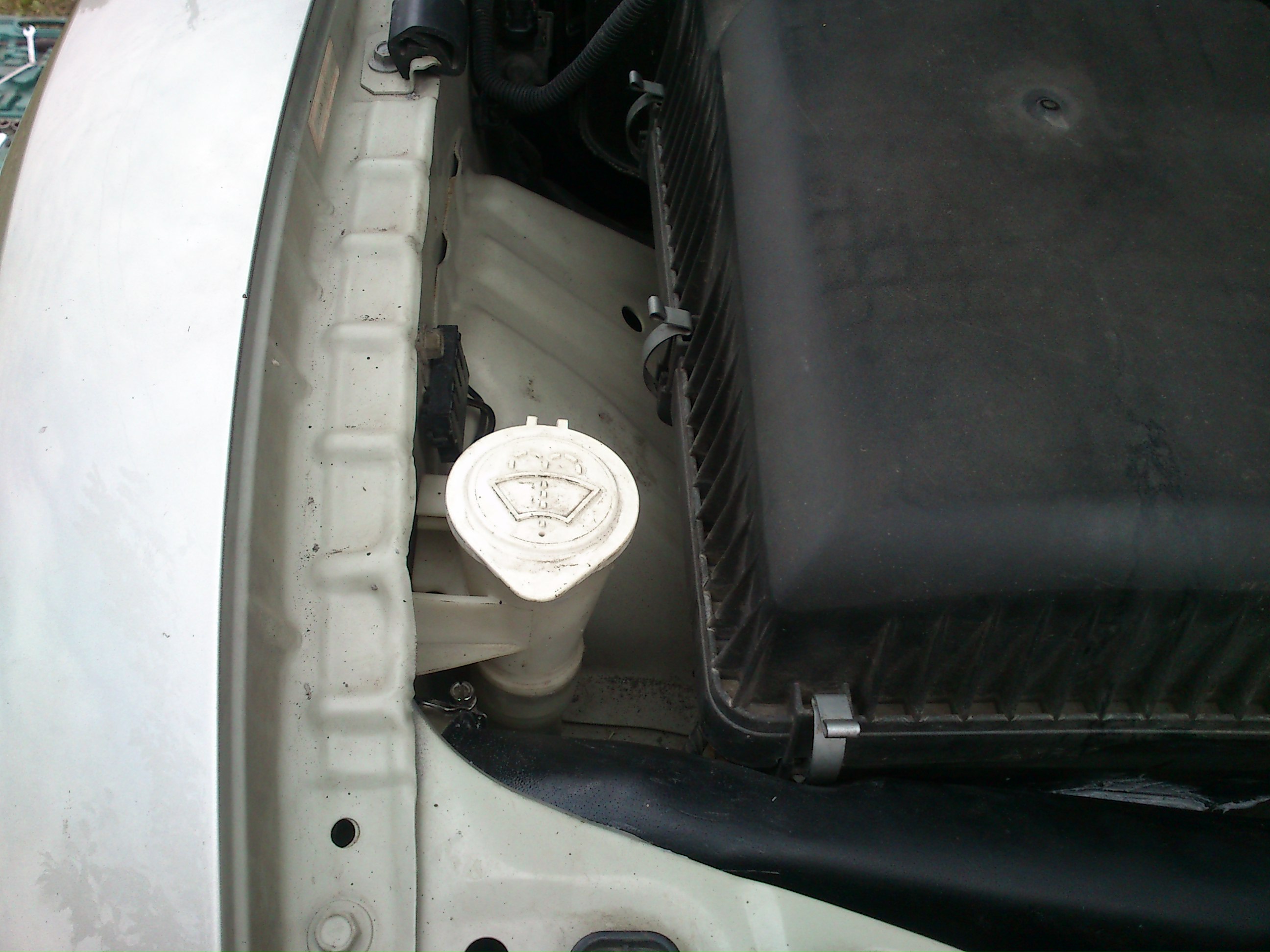 Снять нужно заливную горловину омывалки-мешает!Дыру нужно расширить :*SCRATCH*: Тут кольцевые пилы,по-моему,бесполезны(нет центровочного отверстия),лобзиком тож не подберёшься..В идеале-снять крыло.Но мы ж не ищем лёгких путей-прорежем болгаркой и так :*OK*: Практически наощупь,потихоньку,аккуратно из под крыла-на лоскутки